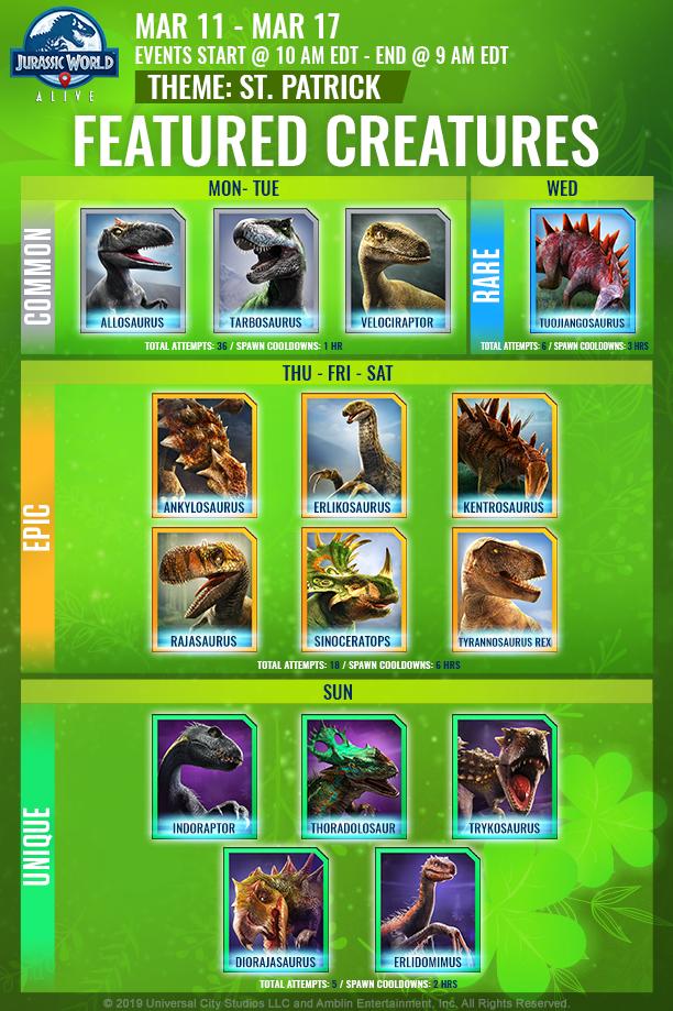 今回のテーマはST. PATRICKということで、聖パトリックの日にちなんだ、緑色=ユニーク恐竜と、その素材恐竜がスポットライトドロップに出現します。選出されたユニーク恐竜5体は先日のアンケートの結果からと思われます。各々狙いたい恐竜を定めて、強化していきましょう。